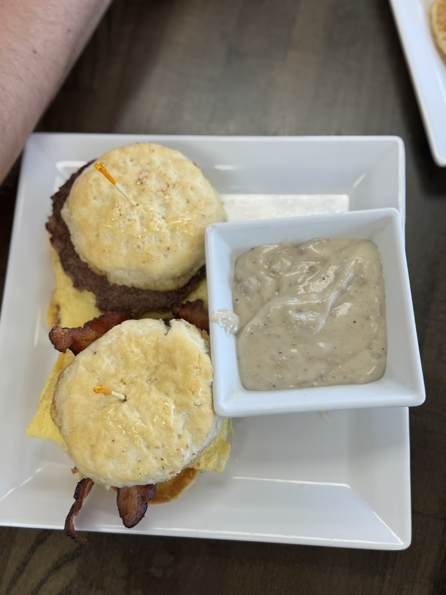 We have been wanting to try this place but the last couple times we been in or passing by they've been packed but today we finally got a seat. I had the black and blue burger. $13.99 The wife had a breakfast sandwich plate with O'Brien style redskin potatoes which I must say were amazing with sausage gravy all part of one meal. $13.99 + .99 up charge for the potatoes VERY reasonable The only reason I gave them a 4 on food is because though it was a very tasty burger I don't feel the value was there for a $14 dollar burger that came with only a pickle spear. We did see other patrons order the chicken sandwiches and they were BEASTS so we're definitely going in again to try one of those. Over all, give this place a try we think you'll find something you'll love, we certainly did.