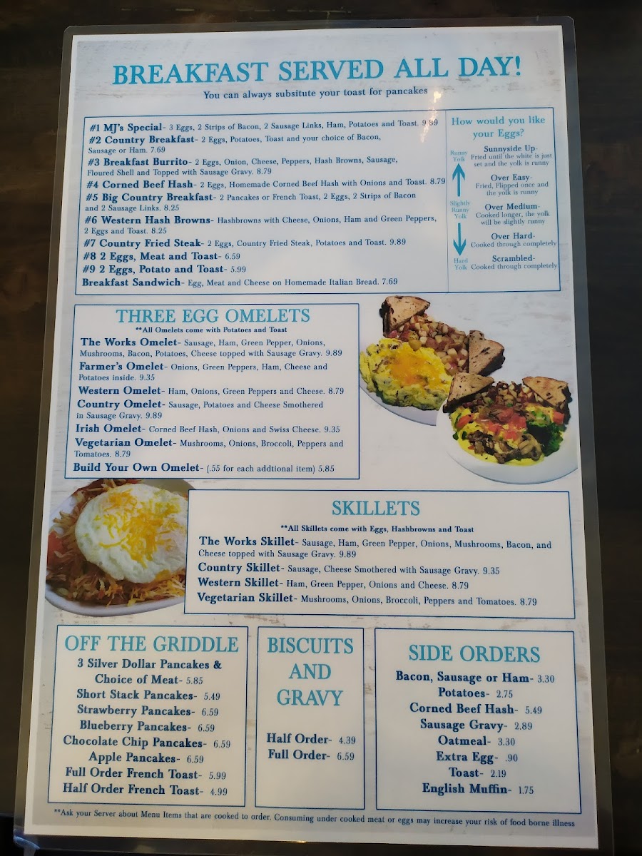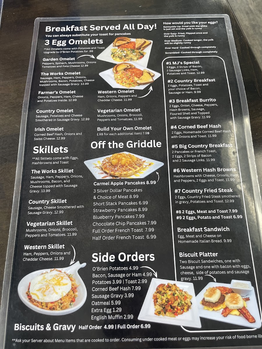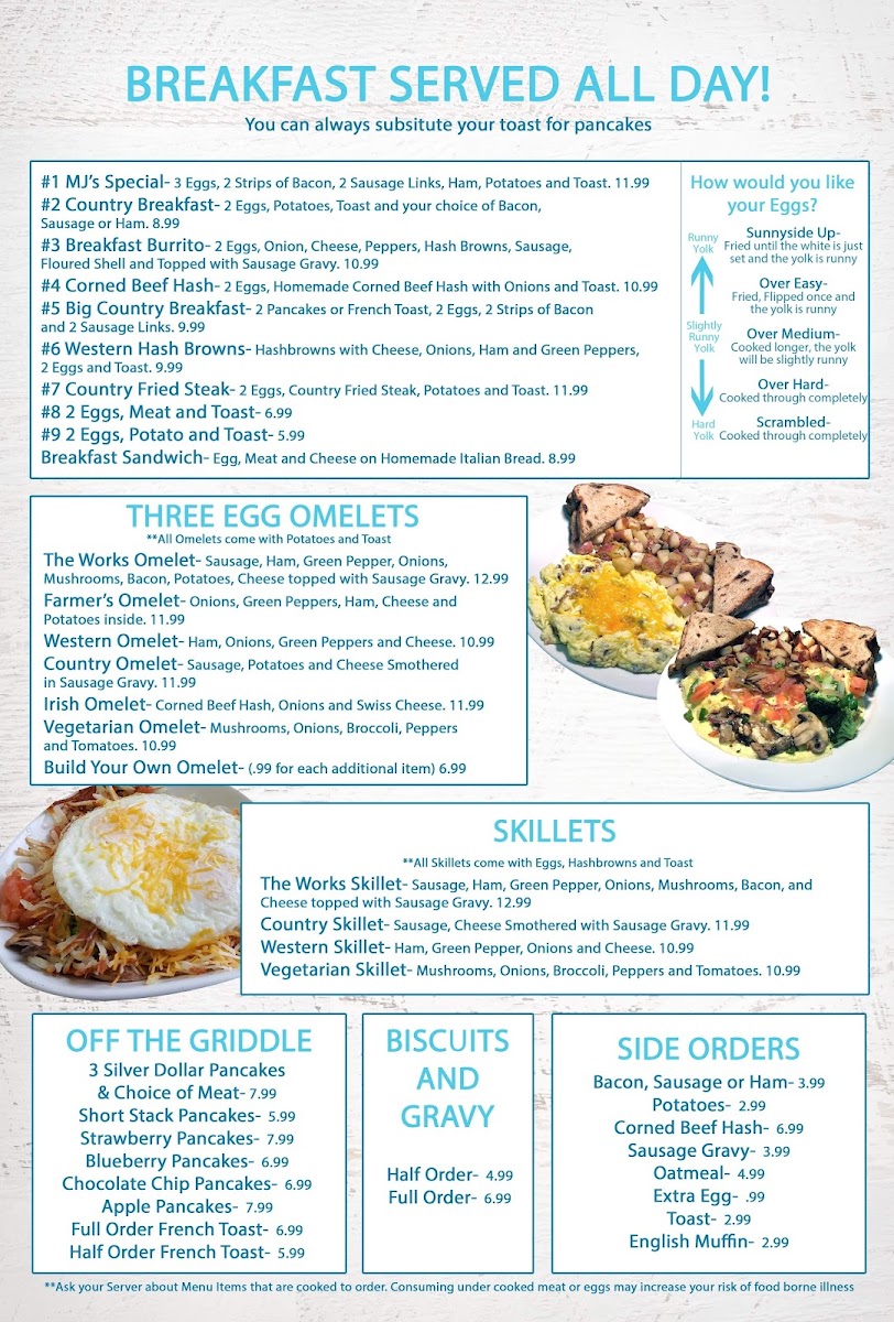 MJ's Eatery offers a straightforward, comforting menu that suits a relaxed, family-friendly atmosphere. Whether you're stopping by for a hearty breakfast to start your day or enjoying a casual lunch with loved ones, the selection focuses on familiar, well-prepared dishes that feel like home.